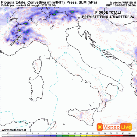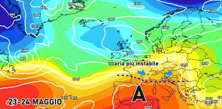 Martedì 24 maggio: irrompono rovesci e temporali diffusi. Instabilità in aumento anche nelle aree interne del centro. Temporali forti su Piemonte, Lombardia, Valle d’Aosta. Temperature in graduale calo a partire dal nord.