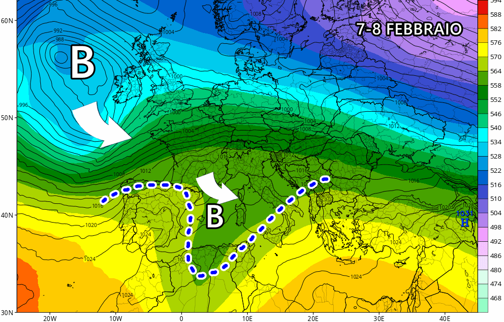 Giovedì 8 febbraio: tornano le piogge sulle regioni tirreniche, veloce perturbazione atlantica in transito da ovest verso est. Temperature in generale calo.