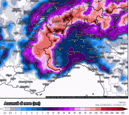 Di seguito gli accumuli di neve attesi mercoledì al nordovest: