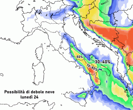 Lunedì 24 gennaio: possibile persistenza dell’aria gelida al sud e sul medio-basso Adriatico, con fiocchi di neve in pianura in Puglia (fenomeni isolati). Piovaschi in Molise, Abruzzo meridionale e Basilicata, con nevicate deboli oltre 500 metri. Altrove freddo e sereno. Temperature in netto calo.