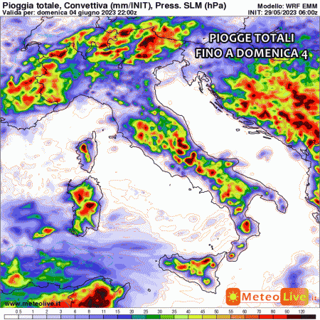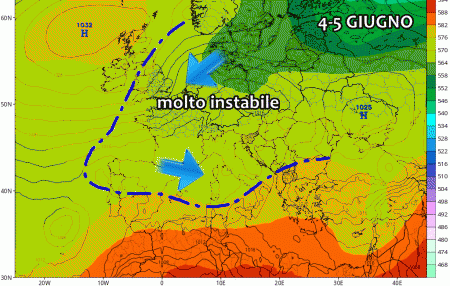 Nelle ultime emissioni dei modelli matematici prende piede un altro forte peggioramento tra 4 e 5 Giugno: come già visto in questo articolo potrebbe palesarsi una vera e propria perturbazione organizzata, non certo solita nel mese di Giugno. Nubi, piogge e temporali diffusi potrebbero attraversare l’Italia, favorendo anche un calo termico.