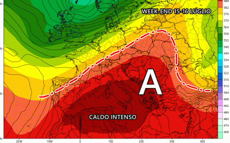 Venerdì 14 Luglio: momentaneo calo termico al nord e ultimi temporali sparsi al Nordovest. Caldo intenso al centro-sud e isole maggiori, punte di 40-41°C nelle zone interne.