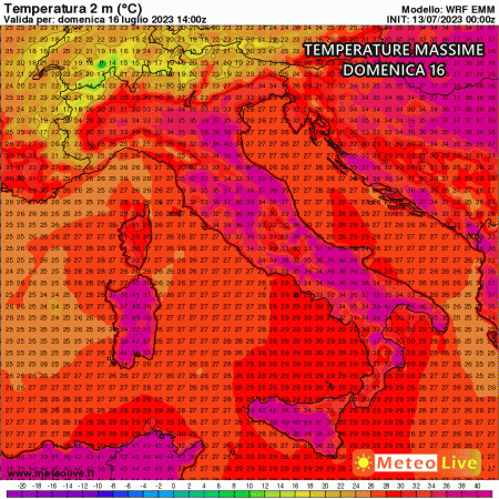 Domenica 16 Luglio: caldo intenso su tutta Italia, punte di 43°C nelle zone interne del sud. Picchi di 40°C anche in Romagna e sulla fascia adriatica.