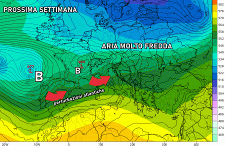 Il maltempo entrerà nel vivo nel fine settimana quando si approfondirà una depressione colma di forti venti di ponente e libeccio, i quali sferzeranno le regioni del sud. Ancora tante piogge sono previste sul settore tirrenico, meno su quello adriatico e al nord. Tuttavia, sul settentrione, irromperà aria molto fredda da domenica che farà scendere la quota neve fin quasi in pianura (come descritto in questo articolo).