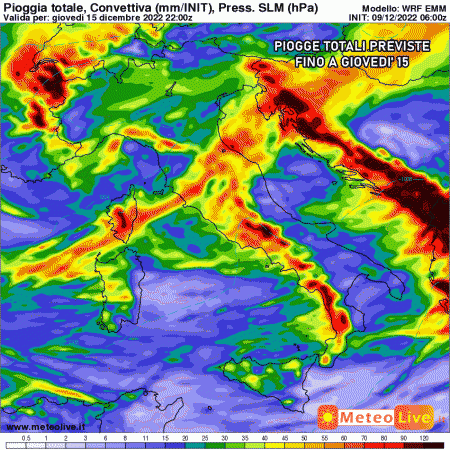 Giovedì 15 dicembre: maltempo al sud e medio-basso Tirreno, breve miglioramento al nord in attesa di un’altra perturbazione con nevicate a bassissima quota (da confermare).