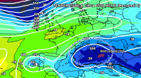 Martedì 7 febbraio: isolate nevicate su Puglia centro-settentrionale, Molise, Basilicata, Abruzzo meridionale fino in pianura. Piogge in Sicilia. Asciutto al nord lato tirrenico. Clima freddo ovunque.