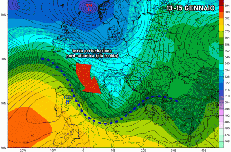 Un altro peggioramento potrebbe concretizzarsi tra 13 e 15 gennaio e rispetto al precedente potrebbe generare una fase perturbata ben più incisiva nonché più fredda e ricca di neve per le nostre montagne!
