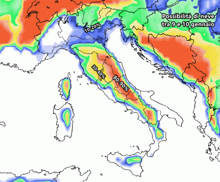 Domenica 9 gennaio: irruzione artica in arrivo al centro e al sud, possibile depressione nel mar Tirreno con precipitazioni estese. Forti nevicate in Appennino, fino in collina al centro. Temperature stazionarie.