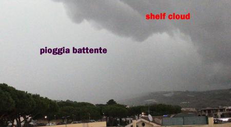 L’arrivo del temporale di oggi a Santa Marinella (Roma), notate la nube a mensola in alto che precede l’arrivo delle correnti discendenti associate a pioggia battente. Foto di Simone Maio.