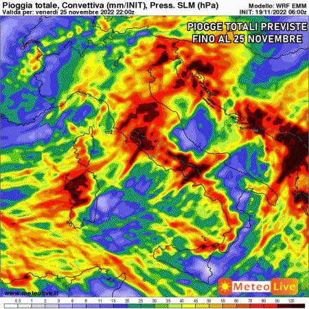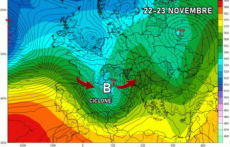 Martedì 22 novembre: profonda depressione sull’Italia con maltempo diffuso e fenomeni intensi sul lato tirrenico, Marche, Emilia Romagna. Nevicate abbondanti in montagna. Venti impetuosi di libeccio e ostro al sud e lato tirrenico, foehn sulle Alpi occidentali dalla sera, bora al nordest.Temperature in calo.