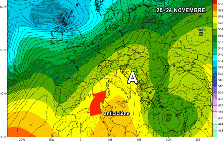 Venerdì 25 novembre: anticiclone su tutta Italia, ma potrebbe risultare momentaneo.