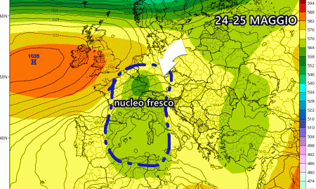 Inoltre, come se non bastasse, da qui al termine di Maggio aumentano sempre più le possibilità per almeno altre due incursioni fresche che accentuerebbero considerevolmente l’instabilità su gran parte del Paese.