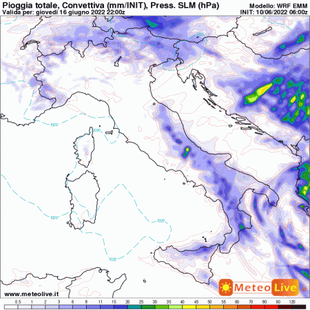 Domenica 12 giugno: stabile e soleggiato ovunque, temperature in aumento ovunque ma in maniera particolare al nord e sul lato tirrenico. Maestrale al sud e basso Adriatico. Di seguito le piogge totali previste nei prossimi 6 giorni, in gran parte concentrate tra sabato e domenica: