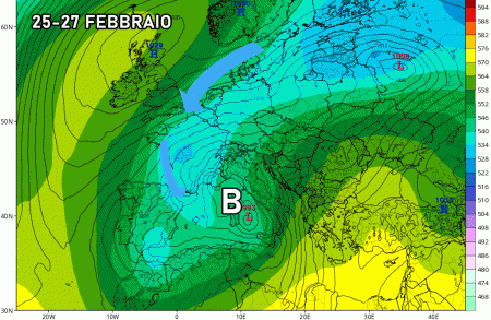 Venerdì 24 febbraio: depressione nel Mediterraneo occidentale, possibili piogge sparse su Sardegna, Liguria, Piemonte, Valle d’Aosta, Lombardia. Neve in alta quota. Netto aumento termico al sud con picchi superiori ai 22-23°C!