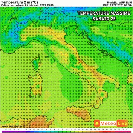 Tra 23 e 25 febbraio è atteso l’affondo freddo sul Mediterraneo occidentale: al nord Italia e Sardegna avremo un aumento delle nubi con piogge sparse, mentre al sud e medio Adriatico il tempo sarà stabile e addirittura molto mite. L’apice delle alte temperature è atteso sabato 25, come potete vedere nella mappa delle temperature massime previste: