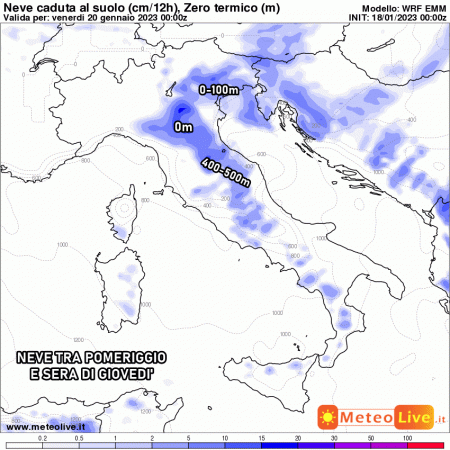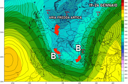 Giovedì 19 gennaio: ancora correnti artiche verso l’Italia, nevicate a quote di pianura su Veneto, Emilia Romagna, cremonese e mantovano. Fiocchi in collina su Marche, Umbria, alta Toscana. Maltempo diffuso al sud.