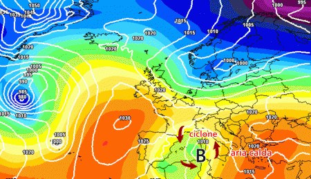 Eloquente la mappa previsionale del modello GFS per il week-end: ciclone in formazione tra Sardegna e Baleari: