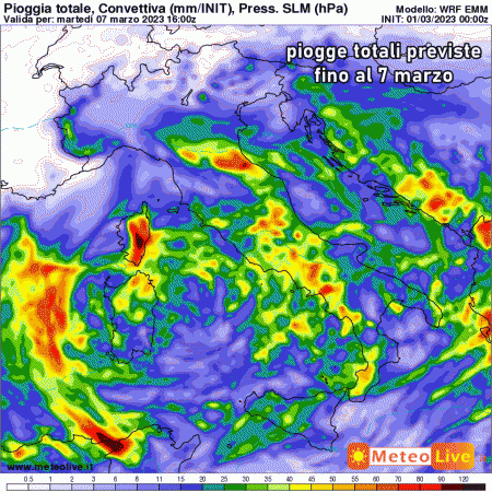 Venerdì 3 marzo: generalmente stabile al nord, depressione sul medio Tirreno con piogge e rovesci sparsi su gran parte del sud, in estensione nuovamente al centro. Possibile approfondimento della depressione in un ciclone dalle caratteristiche simil-tropicali.