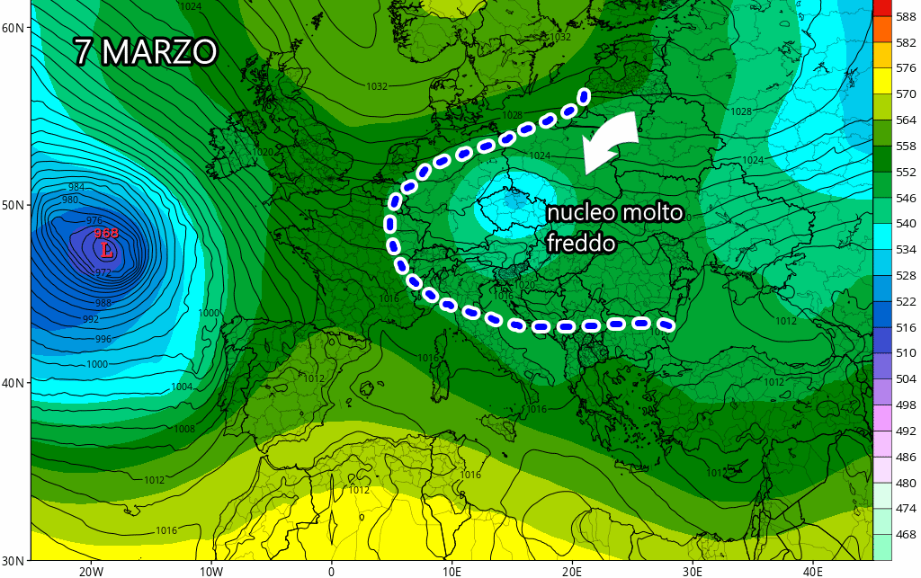 Giovedì 7 marzo: possibile calo delle temperature grazie a flussi freddi da est. Da confermare l’arrivo di altra instabilità.