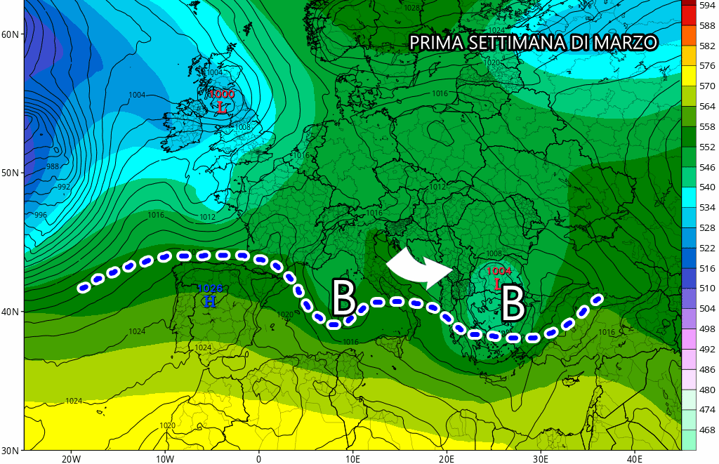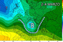 Venerdì 1 marzo: ciclone in risalita verso nord, piogge diffuse al nord con neve sulle Alpi. Migliora al sud.