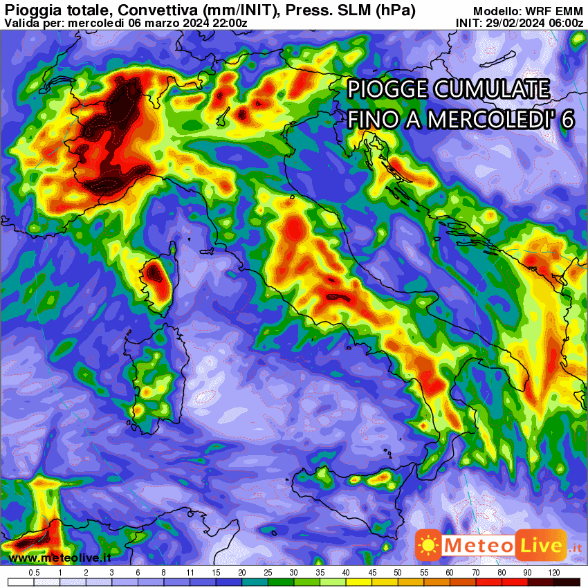 Queste le piogge cumulate previste fino a mercoledì 6 marzo: