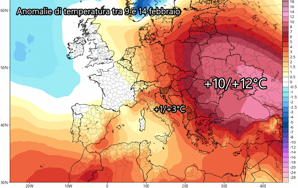 Nel complesso, però, il periodo in arrivo sarà più caldo del solito. Difatti tra l’anomalia media prevista tra 9 e 14 febbraio mostra valori più caldi del nomale.