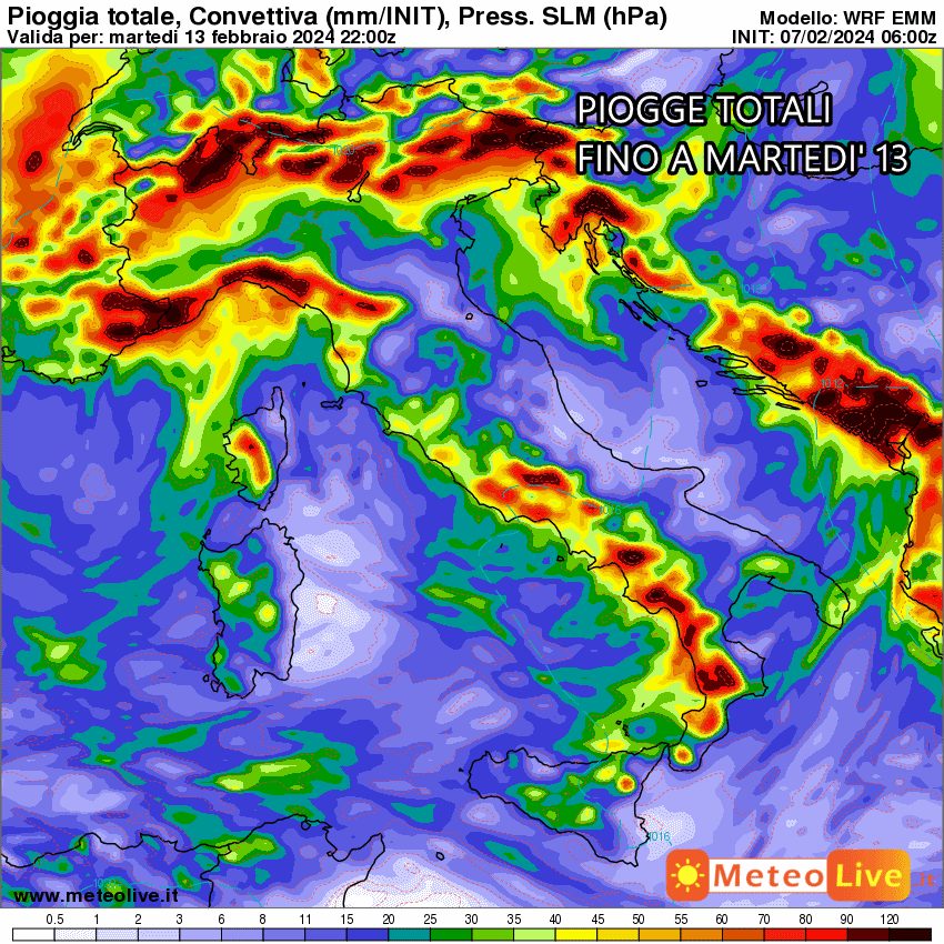 Sabato 10 febbraio: maltempo su tutto il nord e medio-alto Tirreno, isolati nubifragi a ridosso dei monti, neve in alta quota. Temperature in lieve calo.
