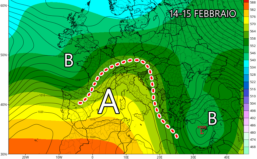 Nel frattempo l’alta pressione delle Azzorre spinge con forza e di fatto spazzerà via questa perturbazione dalle nostre teste tra martedì sera e le prime ore di mercoledì. Insomma il 14 febbraio, giorno di San Valentino, il tempo tornerà a essere stabile e soleggiato su tutto lo Stivale.