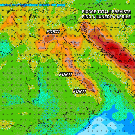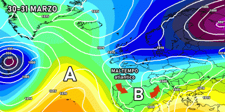 Venerdì 1 aprile: possibile nuovo affondo nord atlantico nel mar Tirreno. Maltempo in intensificazione al nord con nevicate abbondanti sui monti, in graduale calo di quota. Maltempo anche sul lato tirrenico. Temperature in calo.