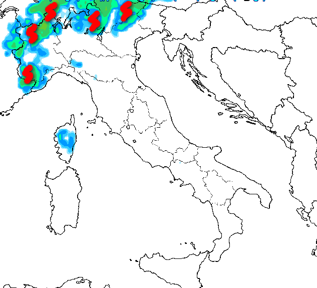 La prima mappa mostra i temporali previsti in Italia nel pomeriggio-sera di sabato 27 luglio: