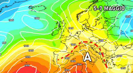 Proprio da giovedì l’anticiclone riprenderà in mano l’Italia, garantendo tempo più stabile e molto più mite da nord a sud ma solo per tre giorni! Dal 5 al 7 Maggio l’anticiclone ci ricorderà che ci troviamo in tarda Primavera, ma le belle giornate saranno bruscamente interrotte da un altro nucleo fresco nord-atlantico previsto tra 8 e 9 Maggio.