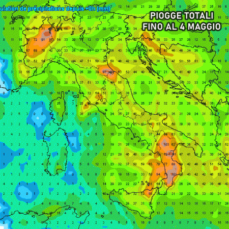 Tra 1 e 2 Maggio la perturbazione si estenderà verso il sud, portando piogge e temporali soprattutto sulla Puglia, Calabria, Sicilia. Inoltre, durante i temporali, ci sarà un elevato rischio di grandine. Inoltre le piogge proseguiranno anche al nord, specie in Emilia Romagna dove il modello europeo ECMWF mostra accumuli di pioggia decisamente abbondanti (oltre i 100 mm).