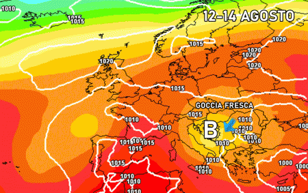 Venerdì 12 agosto: goccia fresca in movimento verso il Mediterraneo e l’Italia. Forte peggioramento al nordest con temporali forti e netto calo termico. Fenomeni sparsi al centro e al nordovest, oltre che al sud. Temperature il calo.