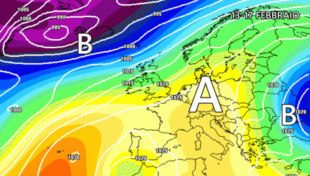 Sabato 18 febbraio: poche variaizoni, l’anticiclone persiste sul Mediterraneo e l’Europa centrale. Possibili refoli più freddi solo per il sud e il basso Adriatico.