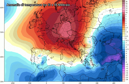 La siccità proseguirà su tutto il settentrione ed il medio-alto Tirreno e come se non bastasse le temperature saliranno anche in montagna dove già la situazione è tutt’altro che rosea per via della mancanza di neve. Andrà leggermente meglio solo al sud dove le temperature non saliranno molto oltre le medie del periodo e la neve abbondante caduta in Appennino avrà maggiori possibilità di resistere. La mappa delle anomalie previste tra 13 e 18 febbraio è molto rappresentativa: su tutto il nord si notano temperature di almeno 6-7°C oltre le medie del periodo, valori assolutamente clamorosi per il pieno di febbraio. Ma sono anomalie che, purtroppo, stiamo analizzando troppo spesso negli ultimi anni.