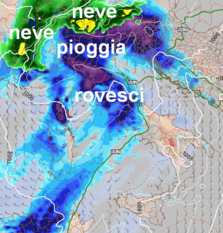 Subito dopo però, cioè domenica 7 febbraio, la depressione sfonderà nel cuore del Mediterraneo determinando un peggioramento su tutto il Paese, ma più intenso al nord, dove tornerà anche la neve sulle Alpi, mediamente oltre i 1300-1500m di quota, qui la sequenza precipitativa divisa tra mattina e pomeriggio della giornata festiva (in verde la neve):