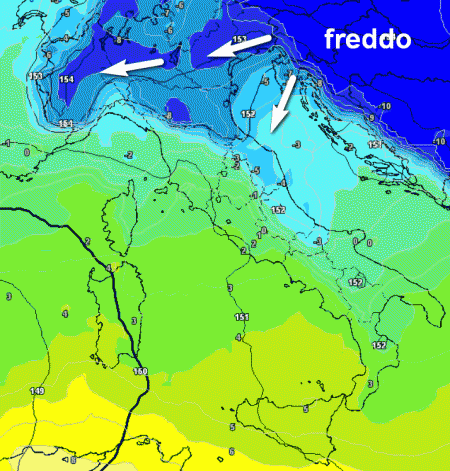 Il calo termico al nord risulterà davvero marcato con temperature che, secondo le ultime emissioni potrebbero spingersi sino a -8°C a 1500m, il che tradotto in pianura significa massime non superiori ai 5°C e rischio di brevi nevicate sino a quote collinari e localmente anche al di sotto.