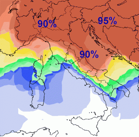 Per finire: quanto è attendibile l’irruzione fredda prevista al nord e sul medio Adriatico? L’abbiamo chiesto alla mappa relativa alla probabilità che la temperatura scenda tra -2 e -4°C a 1500m per domenica 7 e il risultato è sorprendente: probabilità altissima (mentre molto più bassa, 55% quella relativa a valori inferiori a -5°C, qui non riportata): dunque farà freddo su mezza Italia ma non freddissimo…