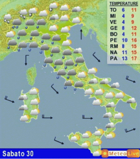 Sabato 30 gennaio: peggiora sui settori meridionali del nord e sul Tirreno nell’arco della giornata con piogge e neve sui monti sopra i 1000 metri. Ancora in attesa il resto d’Italia con nubi sparse senza fenomeni.
