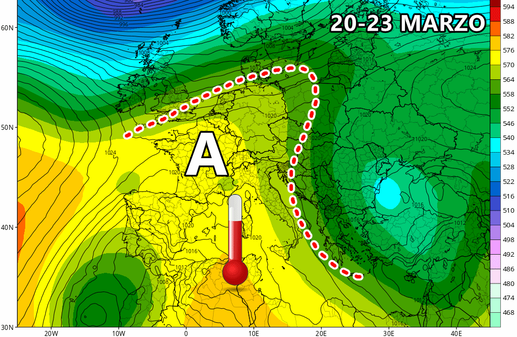 Lunedì 25 marzo: possibile sensibile guasto ad opera di una depressione atlantica colma di maltempo (da confermare).