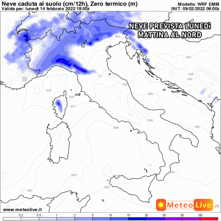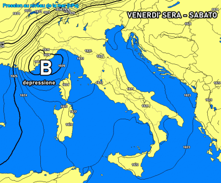 Sabato 12 febbraio: piccola depressione in formazione tra il mar Ligure ed il Tirreno. Piogge sparse al nord, specie nordovest, con neve a quote basse. Maltempo in arrivo anche al centro Italia e sulle isole. Temperature in netto calo.