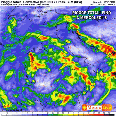 Venerdì 3 marzo: generalmente stabile al nord, depressione sul medio Tirreno con piogge e rovesci sparsi su gran parte del sud, in estensione nuovamente al centro. Temperature in lieve aumento.
