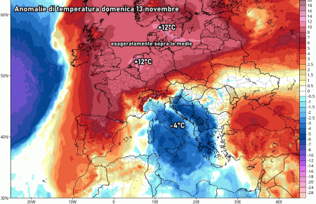 Domenica 13 novembre: irruzione fredda dai Balcani verso il sud Italia ed il basso Adriatico. Piogge sparse e forti acquazzoni specie sui settori ionici. Più asciutto al nord e parte del centro. Temperature in netto calo.