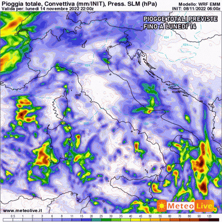 Lunedì 14 novembre: possibile estensione del maltempo al centro Italia ed anche al nordovest e in Sardegna, da confermare. Temperature in calo.