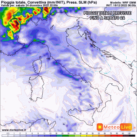 Mercoledì 21 dicembre: blanda perturbazione in arrivo. Nubi in aumento al nord con piogge sparse su Liguria, Lombardia, Alpi occidentali, in rapida estensione al nordest e Toscana. Dalla sera miglioramento da ovest. Temperature in calo.