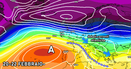Domenica 20 febbraio: lieve indebolimento dell’anticiclone al centro e al nord, possibili deboli e rari piovaschi. Temperature stazionarie o in leggero calo.