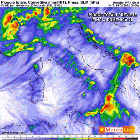 Mercoledì 16 febbraio: maltempo al sud con piogge e rovesci localmente forti su Sicilia, Calabria e Puglia. Residue piogge al centro, migliora al nord.