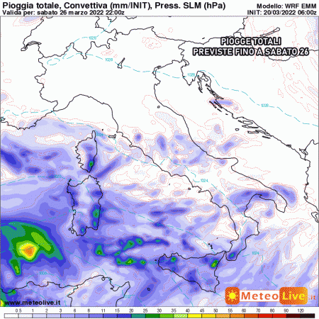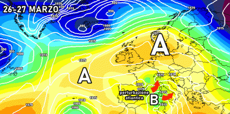 Sabato 26 marzo: possibile peggioramento ad opera di una perturbazione atlantica. Prime precipitazioni in arrivo sulle regioni del sud e le isole maggiori (da confermare).