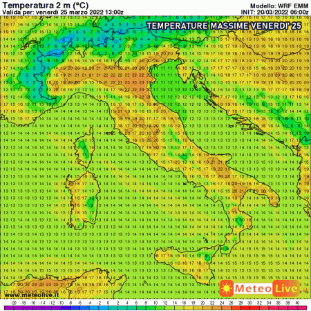 Venerdì 25 marzo: stabile su tutta Italia con Sole dominante. Temperature in aumento, massime fino a 22°C in pianura Padana e zone interne del centro e del sud.