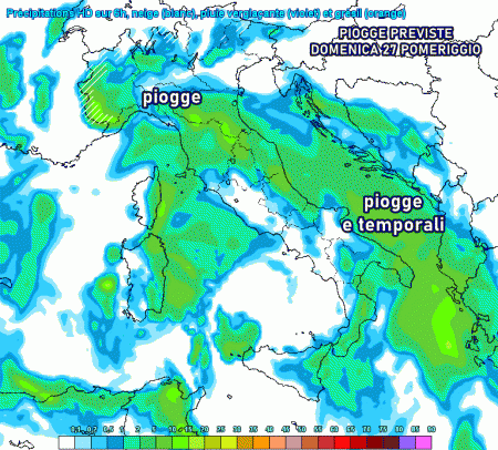 Tra 26 e 27 marzo una perturbazione atlantica potrebbe muoversi verso il mar Tirreno ed il nord, comportando un graduale peggioramento su buona parte della penisola. Le piogge potrebbero coinvolgere anche il nord nel corso di domenica 27, come si evince dal modello matematico GFS:
